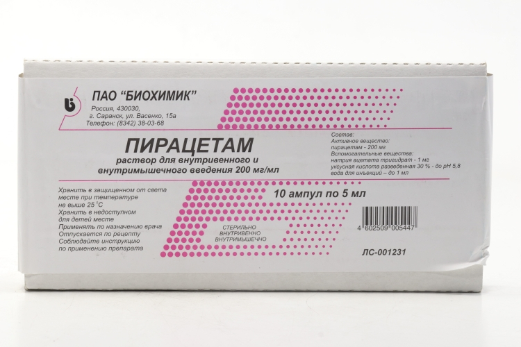 действующее вещество: - пирацетам – 1,0 г в 5 мл; вспомогательные вещества: натрия ацетат, кислота уксусная разведенная, вода для инъекций.