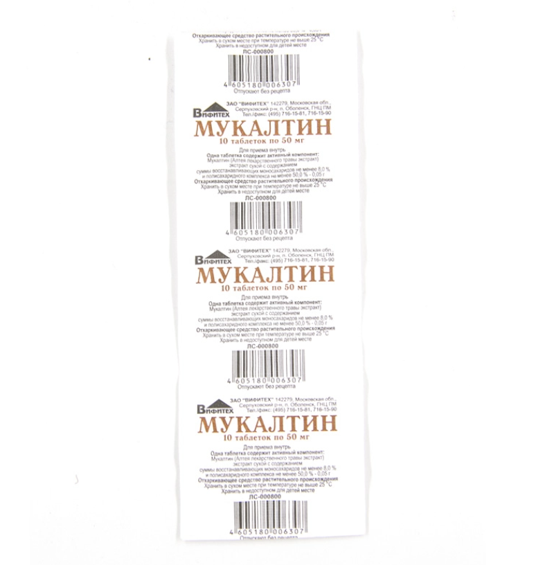 активное вещество: Алтея лекарственного травы экстракт (Мукалтина экстракт сухой) с содержанием полисахаридов в пересчете на глюкозу 18% - 50 мг;