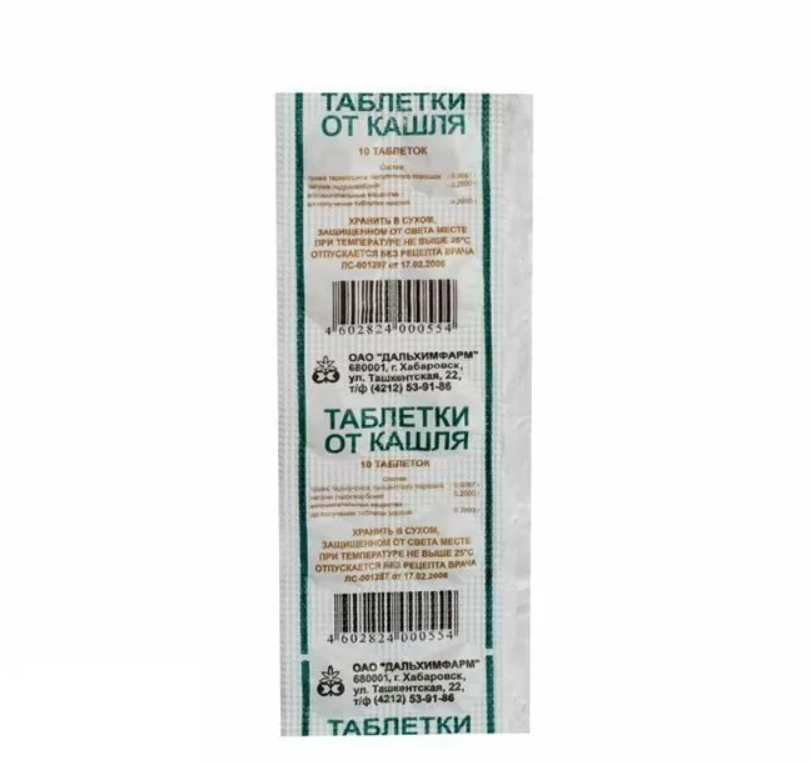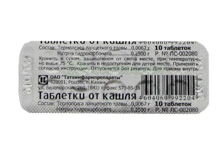 Адсорбенты вяжущие и обволакивающие средства могут уменьшить всасывание алкалоидов входящих в состав травы термопсиса в желудочно-кишечном тракте. Таблетки от кашля не следует применять одновременно с препаратами содержащими кодеин и другие противокашлевые лекарственные средства так как это затрудняет откашливание мокроты.