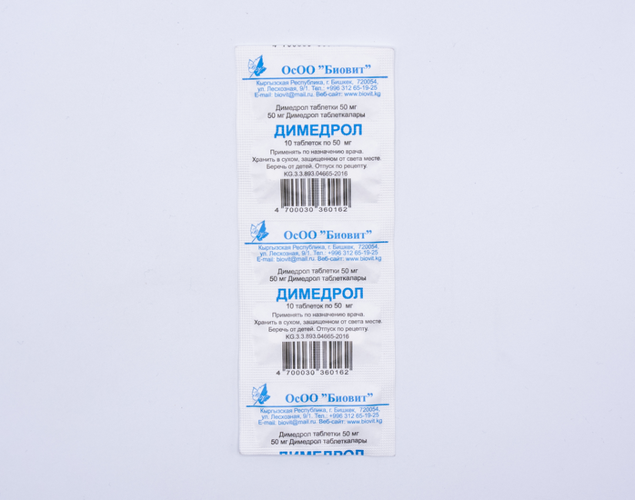 Активное вещество: Димедрола (дифенгидрамин)- 50мг
