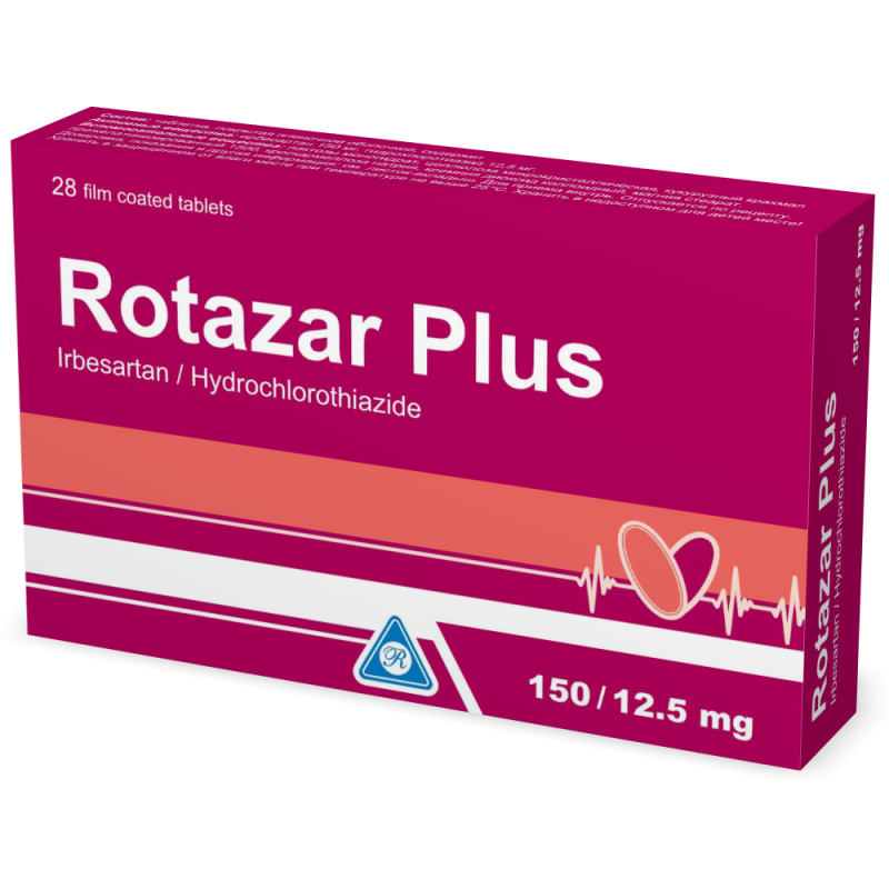 При одновременном применении Ротазар с: - тиазидными диуретиками: усиливается антигипертензивный эффект ирбесартана, предшествующее лечение диуретиками в высоких дозах может приводить к дегидратации и повышает риск развития симптоматической гипотензии в начале лечения ирбесартаном; - с калийсберегающими диуретиками и препаратами калия, заменителями поваренной соли и другими препаратами, повышающими уровень калия в сыворотке крови (например, гепарин): повышается риск развития гиперкалиемии; - другими антигипертензивными препаратами: гипотензивный эффект усиливается; совместим с бета-адреноблокаторами, блокаторами кальциевых каналов;