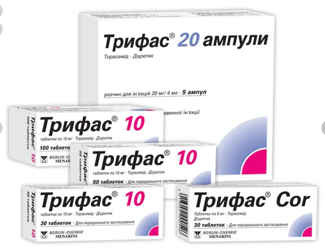 Отеки и выпоты. Лечение начинается с применения 1 таблетки в сутки препарата Трифас ® Cor, что составляет 5 мг торасемида. Обычно эта доза считается поддерживающей. Если суточная доза 5 мг недостаточно, то следует применять 2 таблетки препарата в сутки, что составляет 10 мг торасемида, которую назначать ежедневно. В зависимости от тяжести состояния больного суточная доза может быть увеличена до 20 мг торасемида.