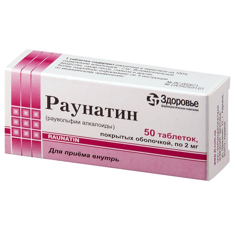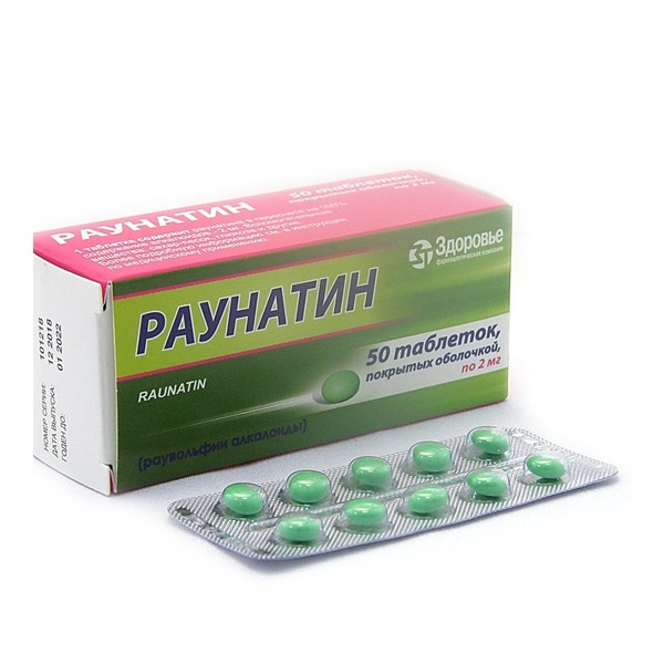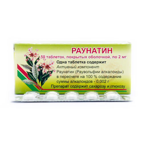 Раунатин - сумма алкалоидов из корней раувольфии, содержание которой в пересчете на сухое вещество составляет не менее 90%. Алкалоиды представлены резерпином, серпентином, аймалином и другими.