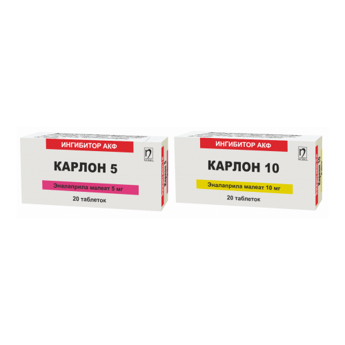 КАРЛОН является ингибитором АКФ продолжительного действия, который применяется для лечения артериальной гипертензии и хронической сердечной недостаточности. Активный метаболит эналаприла – эналаприлат, предотвращает превращение неактивного ангиотензина I в ангиотензин II и устраняет его сосудосуживающее действие. В результате происходит снижение концентрации плазменного и тканевого ангиотензина II. Вследствии ингибирования АКФ снижается артериальное давление, за счет вазодилатации артерий и вен. Он не оказывает существенного влияния на сердечный выброс и на ударный объем. Снижает общее периферическое сопротивление сосудов (ОПСС), уменьшает постнагрузку и преднагрузку, снижает давление в правом предсердии и малом круге кровообращения. Препарат уменьшает гипертрофию левого желудочка. При применении препарата снижается тонус выносящих артериол клубочков почек, тем самым улучшается внутриклубочковая гемодинамика, что препятствует развитию диабетической нефропатии.