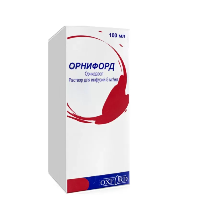 В 100 мл растворе содержится: активное вещество: орнидазол – 500 мг; вспомогательные вещества: натрия хлорид – 0,9% (в/о), вода для инъекций – q.s.