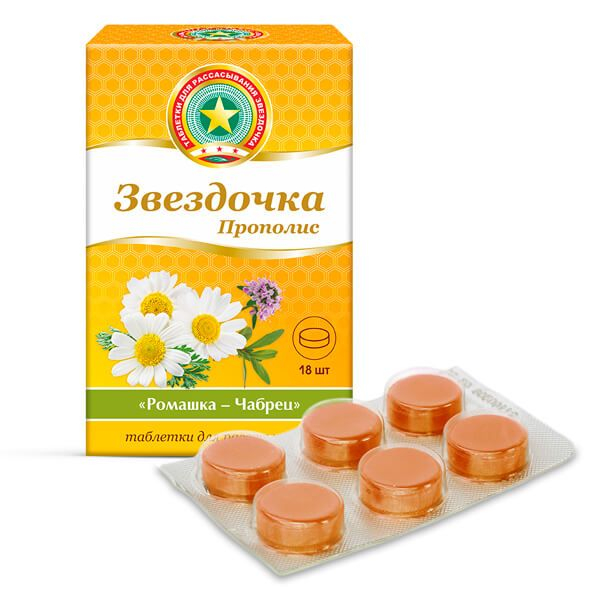 Звёздочка-прополис - эффективная комбинация экстрактов природного происхождения. Активные компоненты, входящие в состав таблеток для рассасывания, рекомендованы при болях в горле, стоматите, повреждении слизистой рта, для лучшего заживления микротравм ротовой полости и при простудных респираторных заболеваниях.