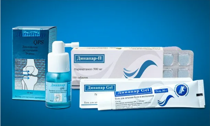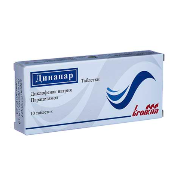 Динапар комбинированный препарат относящийся к группе нестероидных противовоспалительных средств. Диклофенак — НПВП, производное фенилуксусной кислоты, угнетая ЦОГ 1 и 2, нарушает метаболизм арахидоновой кислоты, уменьшает количество простагландинов в очаге воспаления и в здоровых тканях, подавляет экссудативную и пролиферативную фазы воспаления. Оказывает противовоспалительное, анальгезирующее, жаропонижающее, антиагрегантное действие. Парацетамол — ненаркотический анальгетик; неизбирательно блокирует ЦОГ 1 и 2 (преимущественно в ЦНС), слабо влияет на водно-солевой обмен и слизистую оболочку ЖКТ. В воспаленных тканях клеточные пероксидазы нейтрализуют влияние парацетамола на ЦОГ 1 и 2, что объясняет отсутствие у него противовоспалительного эффекта.