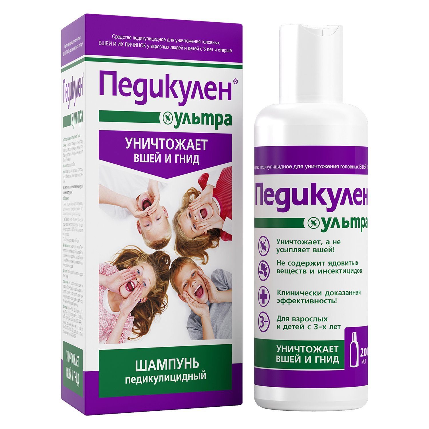 Средство педикулицидное Шампунь «Педикулен Ультра» предназначено для уничтожения головных вшей и их личинок у взрослых людей и детей с 3 лет.