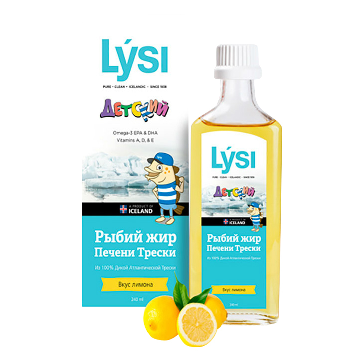 Детский рыбий жир Lysi Omega-3 в жидкой форме с приятным лимонным вкусом от исландского производителя рыбьего жира, содержит витамины А, D и Е, а также Омега-3 жирные кислоты, одна из которых - ДГК играет важную роль в развитии мозга и центральной нервной системы. Витамины А и D необходимы для нормального развития зубов, костей и зрения. Рыбий жир помогает укреплению здоровья и помогает в профилактике многих распространенных заболеваний. Оптимальное для детского организма соотношение ДГК и ЭПК, разрешен к приему детям с 3-х лет, стандартизованное содержание витаминов D, Е, А, рассчитанное исходя из потребности детского организма. Для достижения нужной пропорции смешиваются несколько видов рыбьего жира, преимущественно рыбий жир из печени североатлантической трески с добавлением жира тунца.