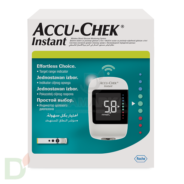 *Система контроля уровня глюкозы крови с беспроводной передачей данных «Accu-Chek® Instant» (Акку-Чек® Инстант) предназначена для количественного определения уровня глюкозы в свежей капиллярной цельной крови из пальца, ладони, предплечья или плеча в качестве дополнительного средства мониторинга эффективности гликемического контроля.